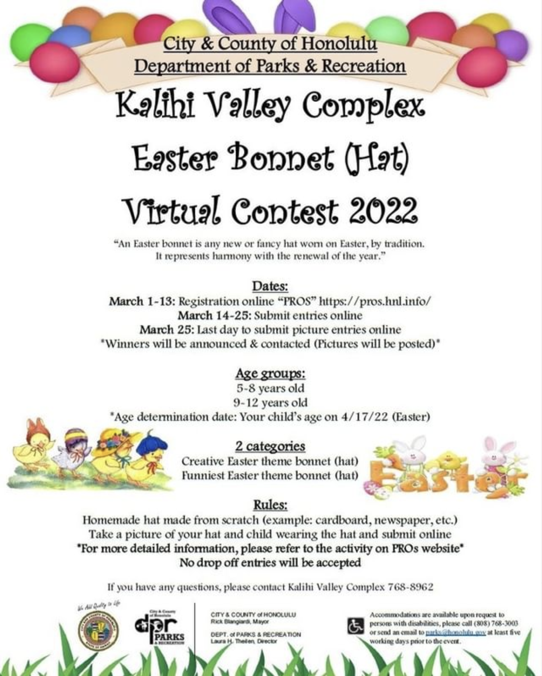 Kalihi Valley Complex team invites you to take part in their 2022 Virtual East Bonnet Contest (an Easter Bonnet is any new or fancy hat traditionally worn on Easter, which represents harmony with the renewal of the year). As part of the contest you'll make a homemade hat from scratch, using materials like cardboard, cloth or newspaper. Then you take a picture of your hat and submit it online! First you'll need to register online at pros.hnl.info from March 1 - March 18. Then, entries will be accepted from March 14 - March 25 with the winners announced and their pictures posted on our DPR social media.