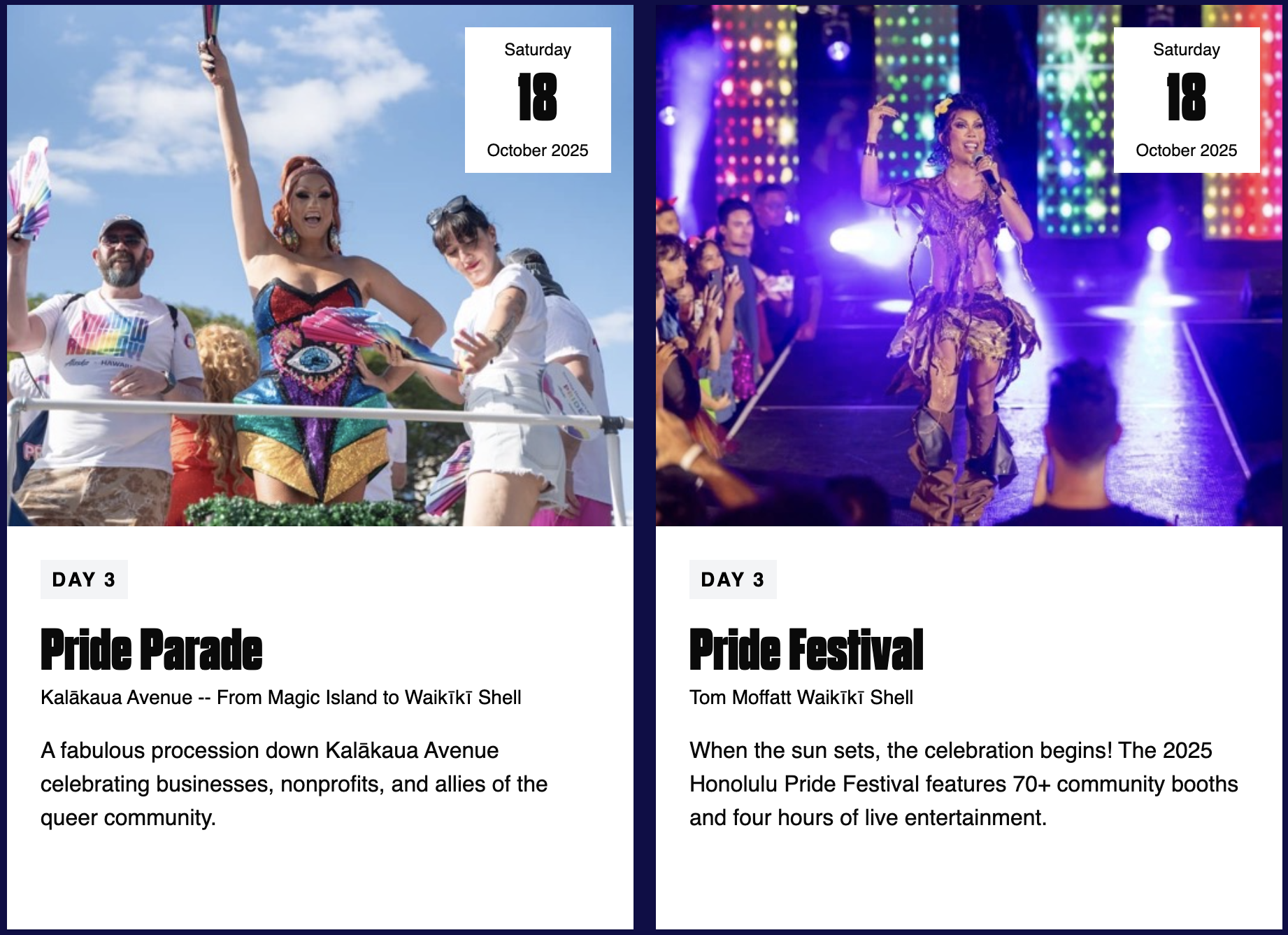 PRIDE FESTIVAL: When the sun goes down, the celebration lights up! The 2025 Honolulu Pride Festival features 70+ booths hosted by community partners and a high-energy, four-hour entertainment lineup.