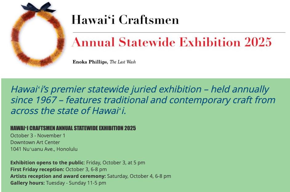 Hawaii Craftsmen Annual Statewide Exhibition 2025 Friday, October 3, 2025 5:00 PM Saturday, November 1, 2025 5:00 PM Downtown Art Center 1041 Nuuanu Avenue Honolulu, HI, 96817 United States (map) Google Calendar ICS Learn more