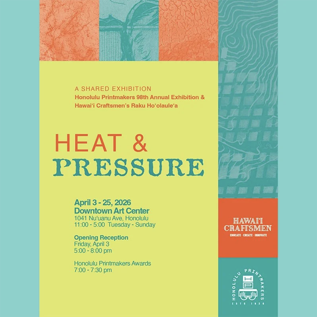 Hawaiʻi Craftsmen and Honolulu Printmakers unite for a collaborative exhibition showcasing local ceramics and printmaking, crafted through the application of heat, pressure, and inspiration.