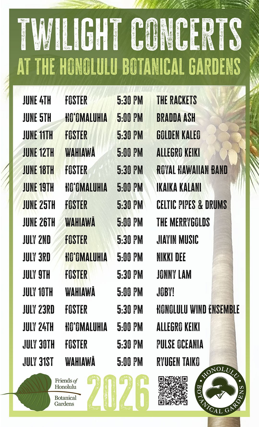 Summer is here, and with it comes a cornucopia of special events hosted in your City’s bountiful botanical gardens! The City and County of Honolulu’s Department of Parks and Recreation is pleased to announce the return of the Twilight Summer Concert Series in June and July.