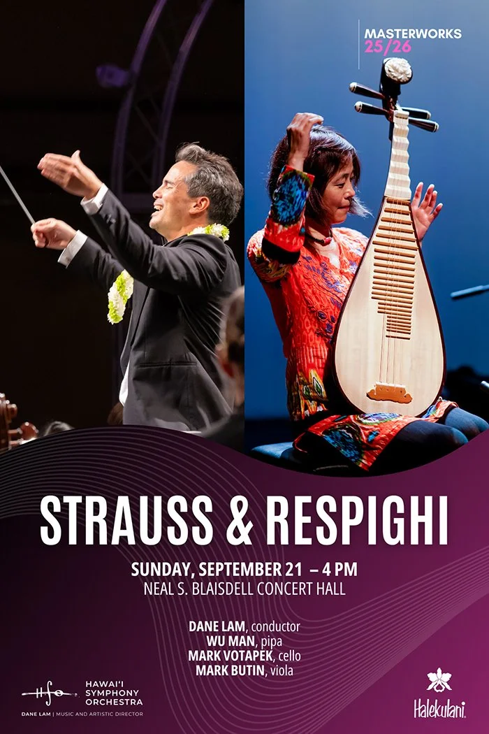 The 2025/2026 Halekulani Masterworks season kicks off with an extraordinary musical adventure along a symphonic Silk Road. The world’s leading pipa virtuoso Wu Man joins forces with Music and Artistic Director Dane Lam and the Hawaiʻi Symphony Orchestra for Jiping Zhao’s captivating Pipa Concerto No. 2, paired with two iconic tone poems: Respighi’s evocative Pines of Rome and Strauss’ Don Quixote featuring principal violist Mark Butin and principal cellist Mark Votapek.